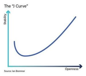 경제학에 “J커브 효과”라는게 있습니다. 환율이 상승(통화가치 하락)하면 처음에는 교과서에서 가르치는 것과는 정 반대로 경상수지가 더 나빠지다가 시간이 지나고, 환율상승이 더 심해진 다음에야 비로서 경상수지가 호전되는 현상을 말하는 겁니다. 이런 J 커브 효과가 보여주는 함의는 특정한 타이밍이나 조건에서는 일반적으로 알려진 법칙과 정 반대로 흘러가는 반동 내지 비정상의 국면이 현실에서는 얼마든지 존재할 수 있다는 겁니다. 이런 J커브효과를 정치 영역에서도 제안한 사람이 이안 브레머(Ian Bremmer) 교수입니다.