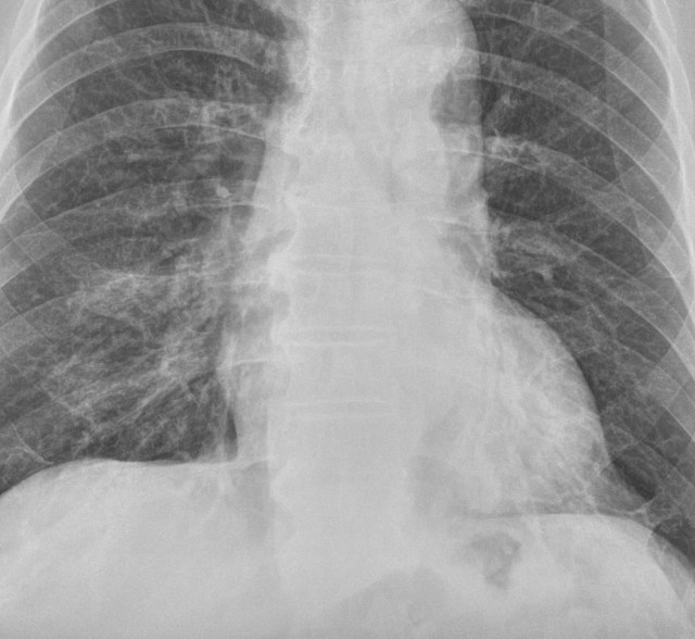 사실 이 환자는 동네 의원에서 폐렴이 의심된다고 해서 내과로 입원한 분입니다. 당연히 폐렴의 가능성을 제일 먼저 확인해야 겠지요. 위 영상에서 뭔가 이상소견이 보이시는지요? 의대생이 졸업을 하기 전에 가슴사진에 대해 공부를 할 때 제일 중요하게 강조되는 개념이 “실루엣 징후”입니다. 사실, 의대생이라도 이 실루엣징후라는 것을 “제대로” 공부했다면 이 사진에서 무엇이 문제라는 걸 금방 알 수 있습니다. 어찌 되었든 간에 이게 흉부단순촬영 영상이라는 것, 그리고 환자의 임상증상을 볼 때 왜 이 사진을 촬영한 것인지 전후사정을 이해할 수 있다면 적어도 “뭔가를 좀 아는” 상태라고 할 수 있습니다. 투자영역으로 따지면 호구까지는 아니고 이제 첫걸음을 떼고 앞으로 나아갈 준비가 되있는 “초보”단계로 볼 수 있습니다.