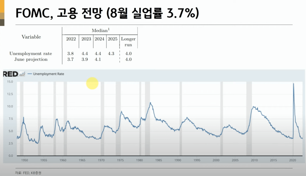 캡쳐한 이미지에서 위쪽에 보이는 표는 연준이 전망하는 실업율이 6월달의 전망보다 훨씨 높아졌다는 걸 보여줍니다. 내년 실업율 전망이 6월달에는 3.9%였다가 이번에는 4.4%로 올라갔습니다. 3개월만에 전망치가 10% 넘게 올라갔네요. 그런데, 여기서 특기할만한 점이 있습니다. 이렇게 올라간 실업율이 2025년까지도 내려가거나 추가로 올라가지 않고 계속 안정된다는 시나리오를 쓰고 있습니다.