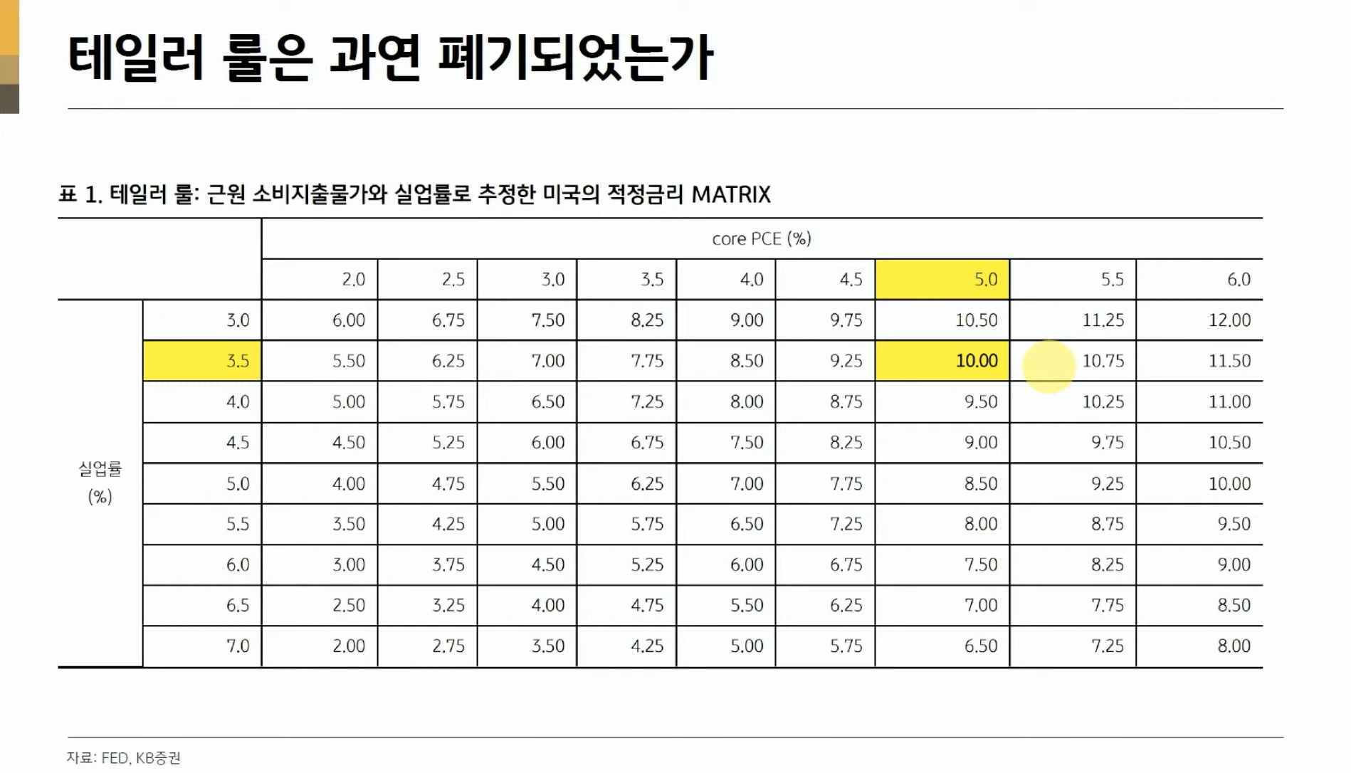 사실, 2020년 코로나 판데믹 시기 때에는 물가상승율과 실업율을 고려했을 때 테일러준칙에 의거한 우리나라의 적정 기준금리가 마이너스여야 했습니다. 그리고, 코로나를 극복한 현재의 적정 기준금리는 8.1%라고 합니다. 하지만, 이렇게 단 2년만에 기준금리를 급격하게 변동시켰을 때 경제와 금융시스템에 가해질 충격은 모르긴 몰라도 괴멸적이었을겁니다. 테일러준칙만 경전 외우듯 외우며 따라갈 수는 없는게 현실이라는거지요. 무엇보다 가계부채 문제가 터지면 그거만큼 무서운것도 없을겁니다.