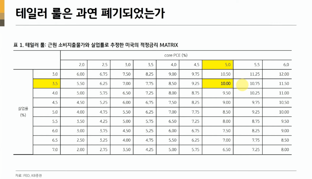 삼프로tv에서 김효진 애널리스트가 제시하고 있는 테일러준칙에 근거한 현재의 적정 기준금리가 무려 10%를 훌쩍 넘긴다는 걸 위의 표에서 보여주고 있습니다. 뭔가 뜨악한 수치가 아닐 수 없습니다. 물론, 지금 당장 기준금리 10%인상을 할 리는 없겠지만, 내년 말에 인플레이션이 연준의 전망대로 상당히 내려오고, 실업율이 이들의 수정된 전망처럼 4.5%를 찍게 된다면 얼추 6%의 기준금리 수준에서 테일러 준칙에서 크게 벗어나지 않게 맞출 수 있다는 게 연주의 시나리오라는 걸 이해할 수 있는 표입니다.