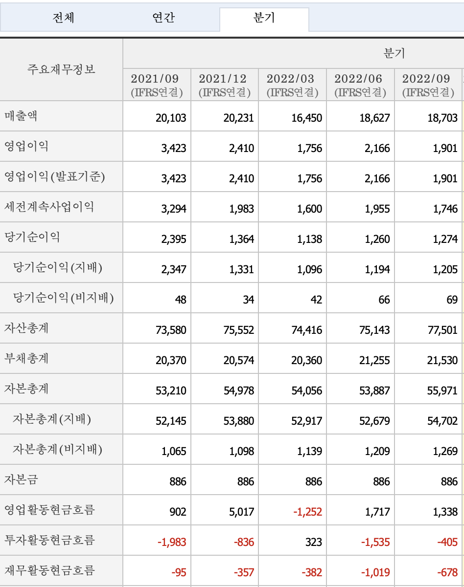실제로 현금흐름표를 보면 최근 3분기까지 악화된 실적으로 인한 타격이 매우 커서 3분기까지 영업으로 창출된 1,118억원에서 법인세 1,231억을 내고 나니 곧바로 영업활동 현금흐름이 마이너스가 되버립니다. 업황 악화에 충격을 상당히 크게 받고 있는 증거라 할 수 있습니다.
