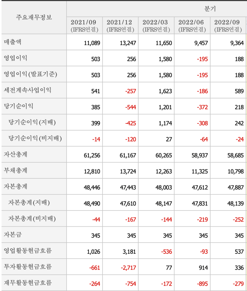 먼저 재무상태표에서 유동자산과 비유동자산 모두에서 가장 변화가 심한 항목이 “당기손익-공정가치측정 금융자산”입니다. 회사가 투자나 단기수익 목적으로 투자해놓은 주식이나 펀드등을 의미하는 항목이며 2022년 3분기 액수가 유동자산 중 3,900억, 비유동자산 중 216억으로 2021년 말 대비(4,908억 / 1,043억) 약 1,900억원이나 줄어들었습니다. 급하게 써야 할 운영자금을 조달하기 위해서인지는 알 수 없으나 미래를 보고 투자했던 주식들을 열심히 팔아서 돈을 쓰고 있는겁니다. 딱히 투자를 늘리고 있는 상황도 아닌데 말이죠.