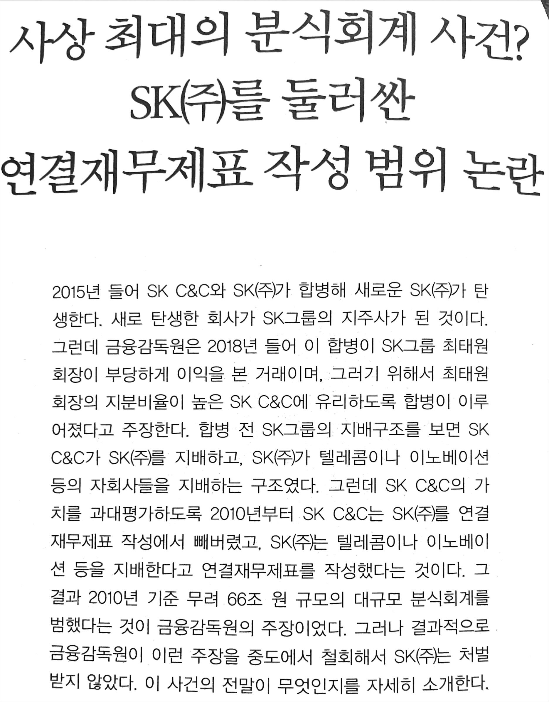 이제 금감원이 문제를 제기한 건 2015년 구SK(주)와 SK C&C 가 합병할 당시 SK C&C의 주가를 끌어올리기 위해 분식회계를 했다는 겁니다. 오너인 최태원씨가 지분을 많이 가지고 있는 SK C&C의 합병비율을 늘리기 위해 썼다고 지적한 방법은 2011년 IFRS 도입 당시 지주사였던 SK C&C 회계를 연결재무제표로 작성하지 않았다는 것입니다.