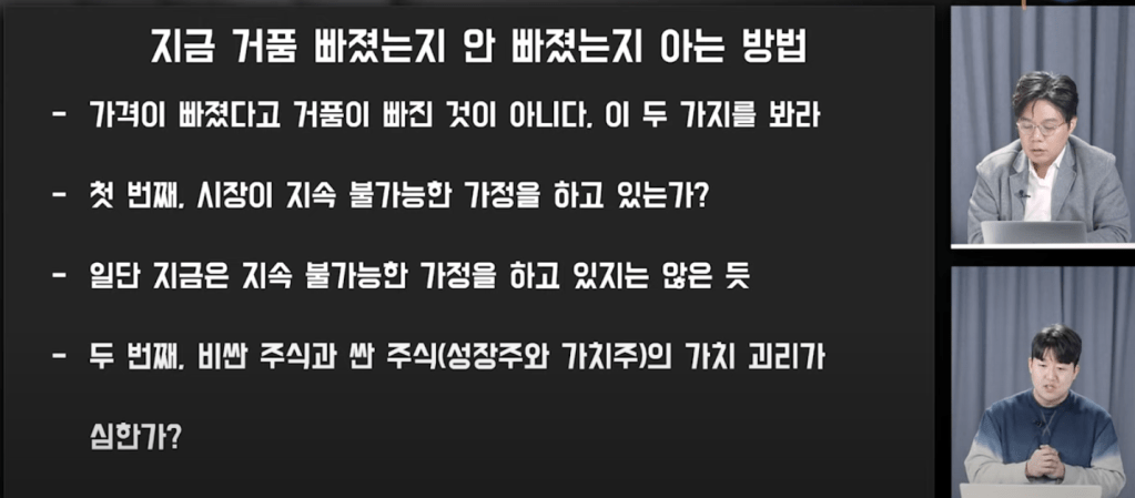 유투브 채널인 이효석아카데미에 나온 영상 중 한 장면입니다. 클리프 애즈니스라는 퀀트 투자자의 영상을 소개하는 대목인데, 자산시장에 거품이 남아있는지 아닌지를 확인하는 두가지 잣대에 대해 언급하고 있습니다.