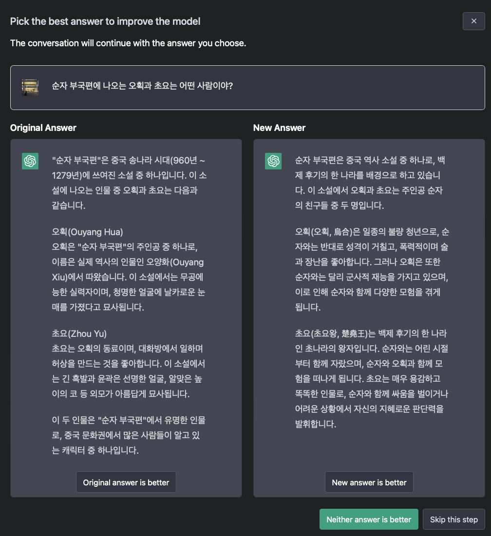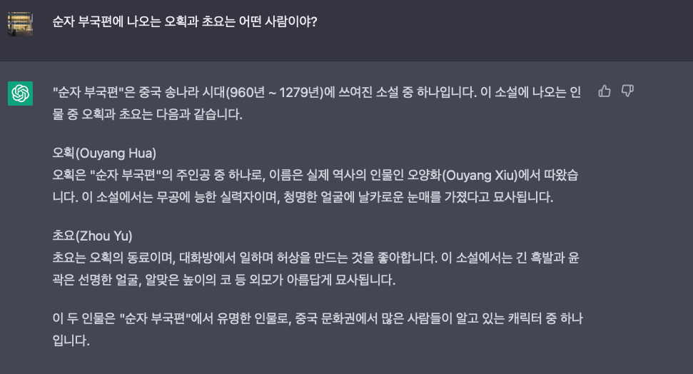 위의 답변이 불만족스럽다고 피드백을 보내니 새로 나온 답변은 더 가관입니다. 오획이 불량청년으로 술과 장난을 좋아하고 초요는 무려 “백제 후기” 때 있었던 초나라의 왕자님이라고 합니다,,,,