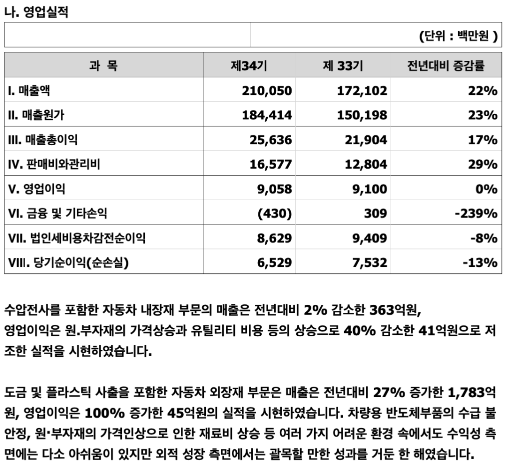 (자동차부품) 자동차부품 부문은 원자재 가격 상승 및 하반기 수급 개선의 영향으로 매출액은 전년 동기 대비 22% 증가한 2,101억원을 기록하였습니다. 원가 및 비용부담 증가로 이익률은 전년 대비 감소하였으나, 이 또한 상반기 대비 각종 부품 공급차질 현상이 나아진 하반기에 큰 폭으로 개선되었습니다.