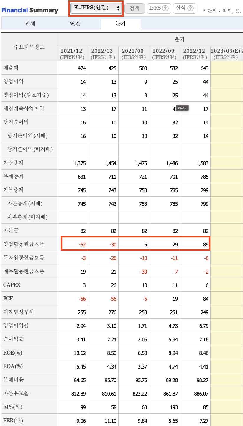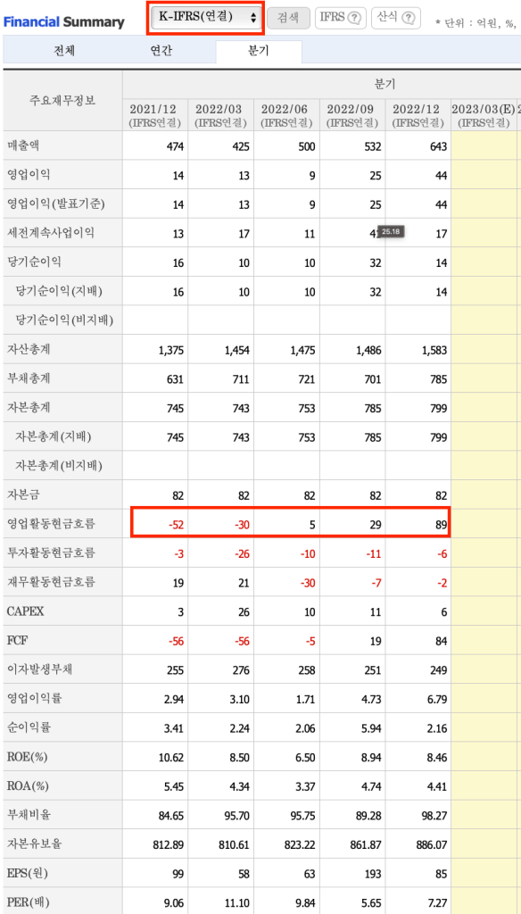 실적을 보면 단순히 매출과 영업이익만 매분기 호전되고 있는게 아니라, 영업활동현금흐름도 극적으로 개선되고 있습니다. 앞서 삼영무역의 사업보고서에 나와있는 하반기 실적개선을 확실하게 확인할 수 있었습니다. 원래 한국큐빅은 삼신화학공업의 설비증설 때문에 부채비율이 높았던 회사였으나 크게 개선되었으며(160% -> 98%), 부채비율의 개선폭보다 이자발생부채의 감소가 훨씨 더 크게 개선되고 있기 때문에 2022년 내내 재무적으로도 나쁘지 않았습니다.