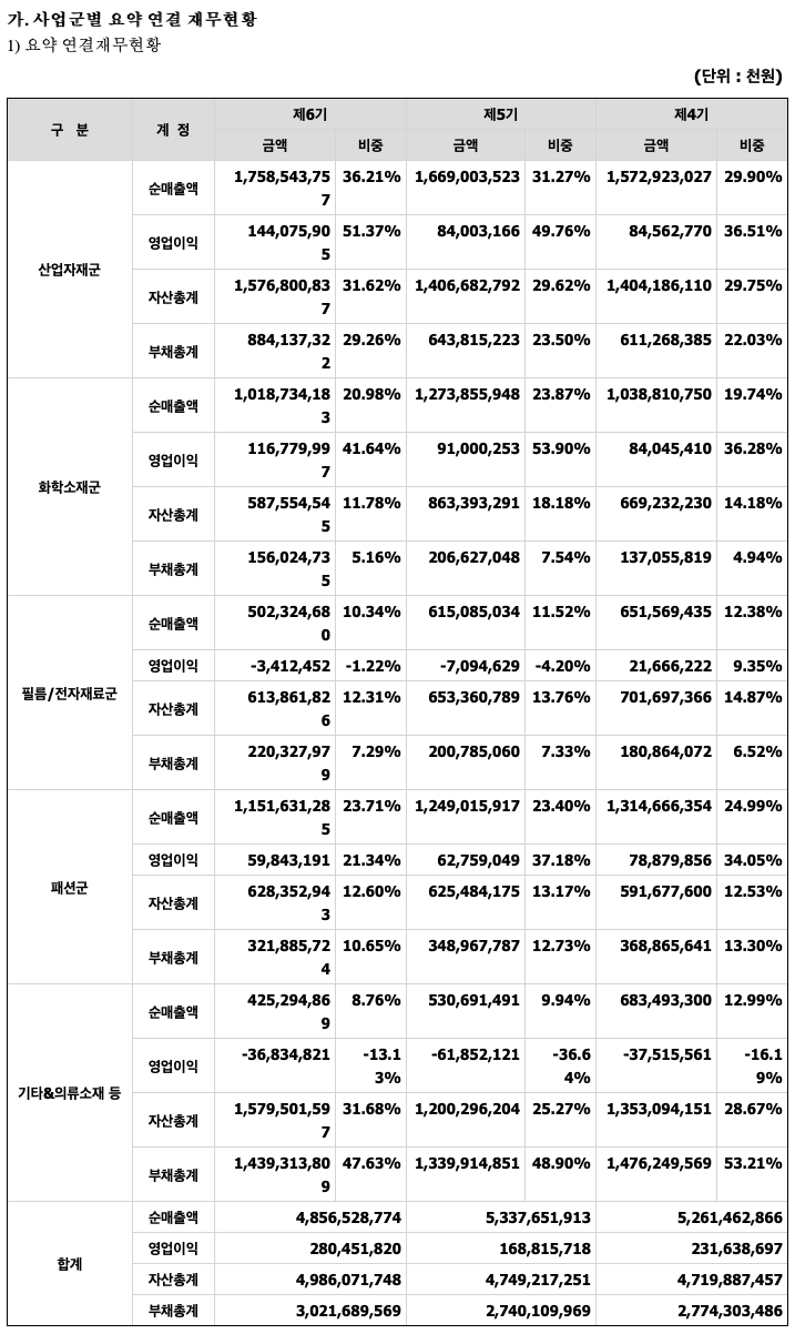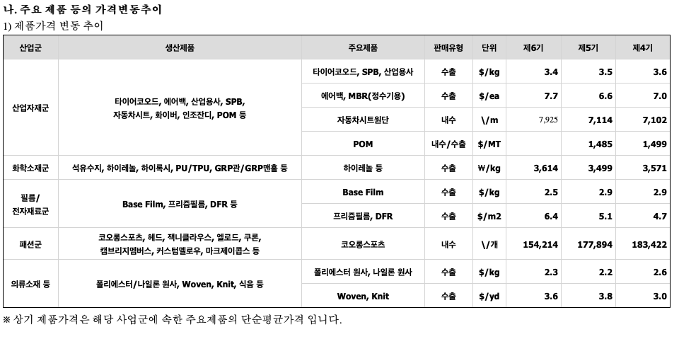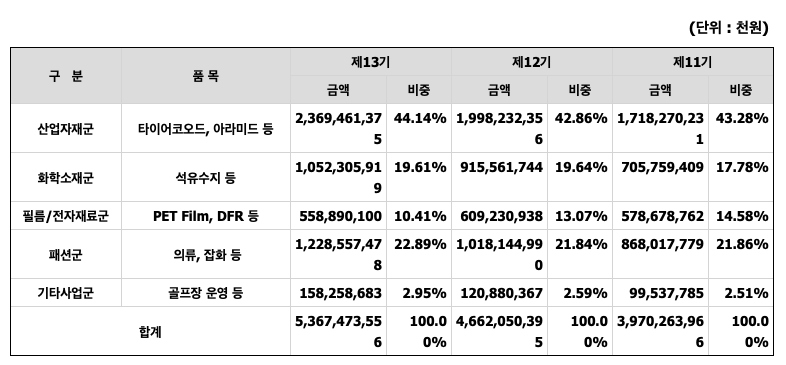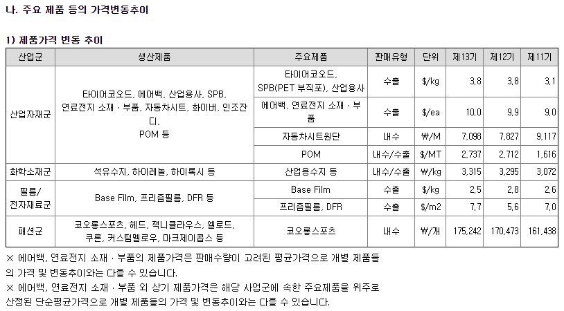 제품의 단가는 2022년(제13기)이 2015년(제6기) 대비 산업자재쪽은 크게 올라갔지만, 자동차시트원단 및 석유화학제품은 가격이 크게 떨어져있어서 위축되고 있는 경기상황을 고스라니 반영하고 있습니다. 최근 IT산업과 디스플레이업계의 불황이 심각하지만, 아직은 제품가격이 떨어지는 상황까지는 아니고, 판매량만 줄어드는 단계입니다.
