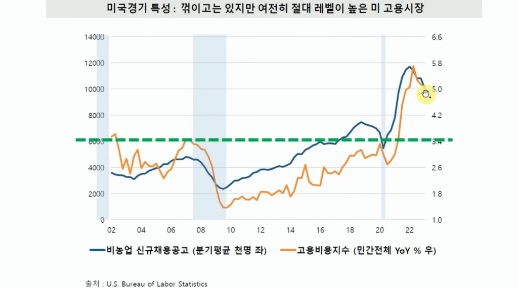 반면, 고용상황이 정상수준을 향해 회귀하는 속도가 상당히 급격하다는 점은 무시해서는 안되는 부분입니다. 왜 고원지대를 잠시도 형성하지 못하고 급하게 내려가는가를 생각해봅시다. 연준의 공격적인 금리인상? 장단기금리역전에 의한 금융권의 위기? 그런 것들은 고용상황이 가파르게 올라갈 때에도 계속되던 현상이었습니다. 직접적인 원인이 아니라는거지요.