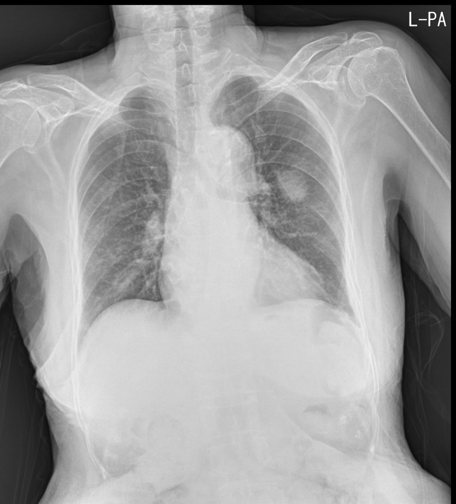 91세 여자 환자로, CT에서 왼쪽 폐에 폐암이 발견되었으나, 고령과 전신상태가 여의치 않아 수술을 포기한 분의 단순 흉부X선 영상입니다.