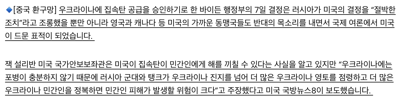 위의 뉴스는 이철 박사의 브런치 “한눈에 보는 중국” 7월10일에 나오는 단신입니다. 우크라이나 포병을 위해 미국이 집속탄 공급을 승인했다는 소식인데, 이 소식이 시사하는 바가 크다고 봅니다. 집속탄은 UN에 의해 사용 뿐 아니라 보유와 제조 및 이동까지도 금지되어있습니다. 집속탄에는 여러 종류가 있지만, 미국이 우크라이나에 공급을 승인한 것은 대기갑용 집속탄으로 보입니다. 여기서 공급하게 될 집속탄의 종류는 전혀 중요하지 않습니다. 이는 러시아의 조롱과 유럽의 반발, 그리고 UN의 금지라는 명분을 저버리면서까지 집속탄을 써야 할 정도로 상황이 “절박”하다는 것을 시사합니다.