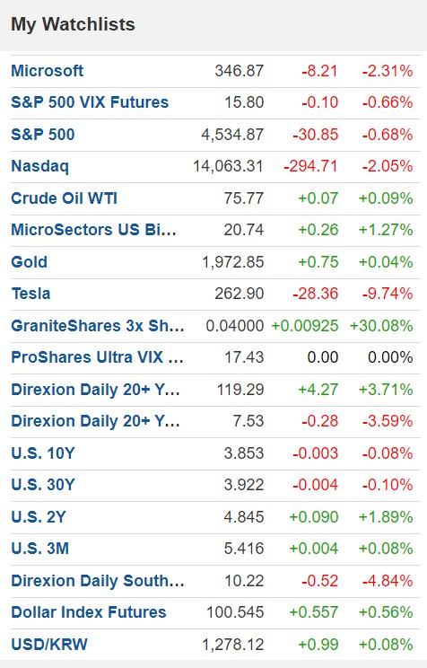 오늘 아침에 보여준 미국시장 시장상황입니다. 미국채 금리가 하락한거처럼 보이나, 실은 어제 상당히 크게 올라서 30년물 금리가 다시 3.9%를 넘긴 상황에 나스닥의 하락이 눈에 띄입니다.