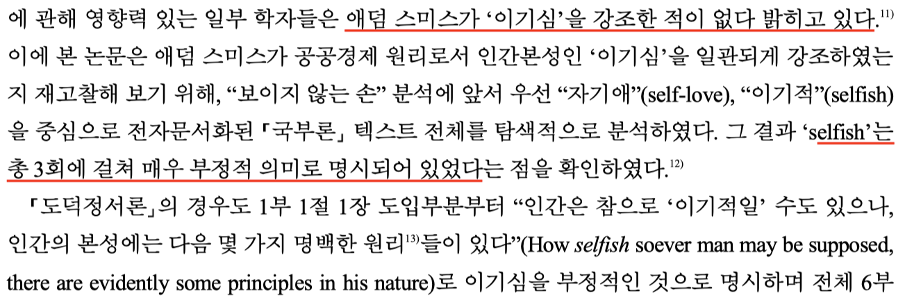 위 링크는 한국 행정학보에 기고된 논문 “적정의 감각에 바탕한 보이지 않는 따뜻한 손 : 국부론과 도덕정서론에 나타난 자기애와 이기심의 차이를 중심으로”라는 논문을 다운받을 수 있는 링크입니다. 유료로 다운받을 수 있지만, 초록 내용만 봐도 내용의 핵심은 파악할 수 있습니다.