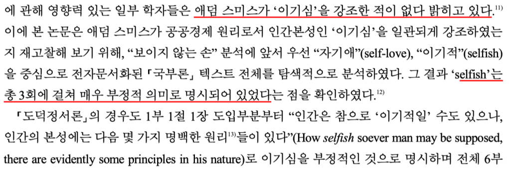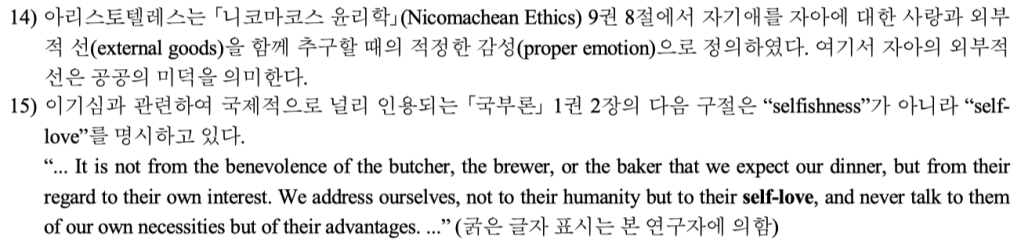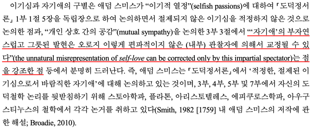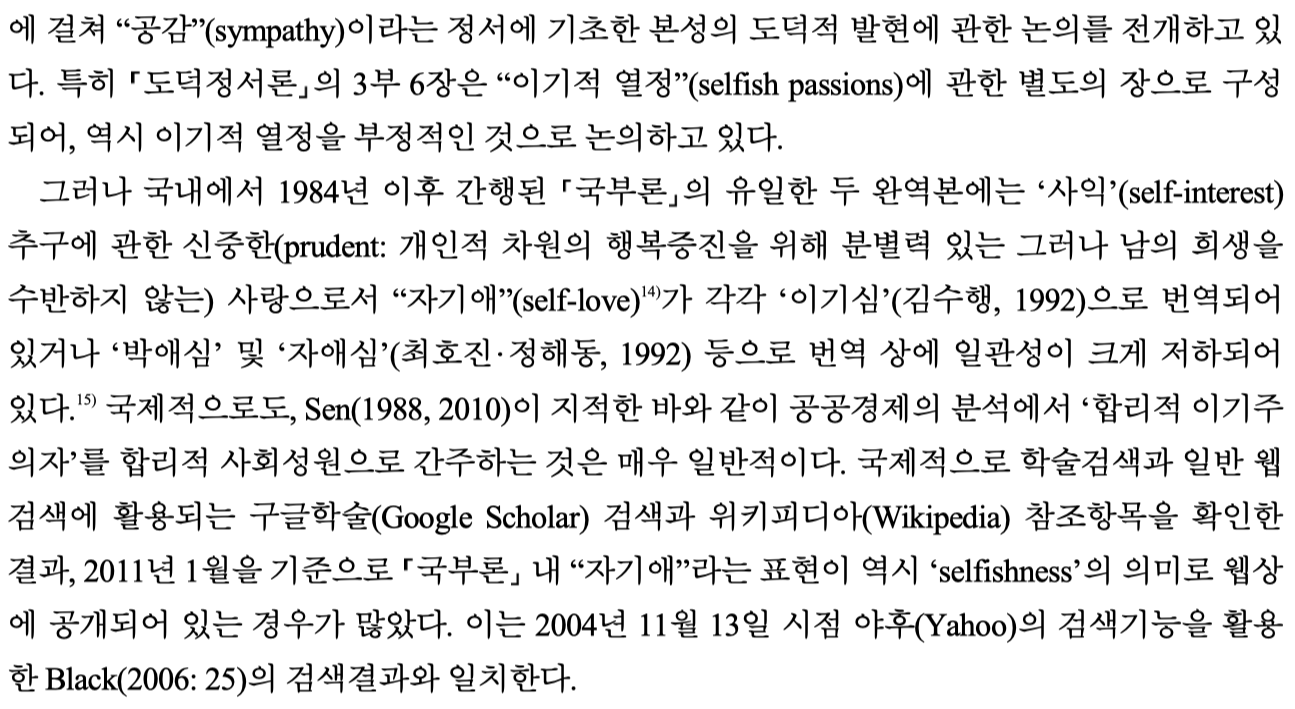 애덤 스미스의 저작들에서 selfish는 명백히 부정적인 감정으로서의 이기심을 지칭하고 있으며, 그러한 이기심에 대비되는 긍정적인 감정으서는 사익추구에 관한 신중한(prudent, 개인적 차원의 행복증진을 위해 분별력 있지만 남의 희생을 수반하지 않는) 사랑의 한 형태로서 자기애(self-love)를명시하고 있지만, 국내 번역본에서는 이들을 모두 “이기심”으로 번역하고 있었다는 겁니다.