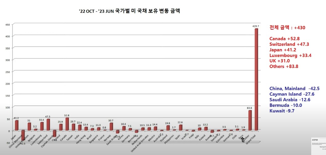 놀랍게도 전체 국가들로 본다면 어마어마한 양의 미국채를 해당 기간동안 매입했습니다. 전세계적으로 보면 무려 430 billion dollar어치 미국채를 미국 외의 나라에서 사간거지요. 인플레이션으로 인해 미국채 금리가 상승하자, 매력이 올라가 전세계 여기저기에서 미국채를 자산 포트폴리오에 편입한 겁니다.
