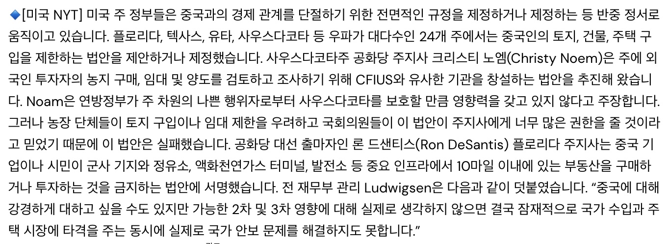 이제는 연방정부를 넘어 주정부들도 경쟁적으로 안보를 명분삼아 중국경제와의 연결을 조금씩 해체하기 시작하고 있습니다. 중국인의 부동산 구매나 투자에까지 이정도로 간섭을 하고 까다롭게 구는 건 충분히 비공식적인 장벽의 역할을 할 수 있는 조치들입니다. 그리고, 이러한 강경한 태도를 여당이 아닌 야당인 공화당에서 더 공격적이고 강경하다는 점은 자못 심각한 점입니다.