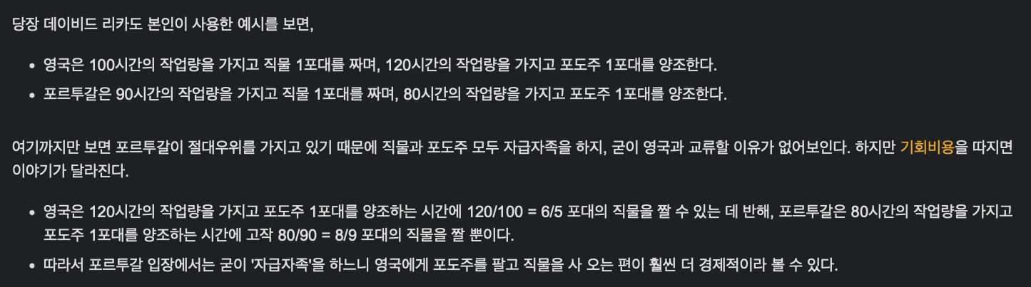 비교우위론은 무역에 있어서 한쪽 나라에 절대우위를 차지하는 품목이 없더라도, 상대적인 우위, 즉 비교우위가 존재하는 품목을 서로 교환하면 기회비용을 절약할 수 있어서 무역을 하는 양국에 모두 이점이 존재한다는 유명한 이론입니다. 고등학교 사회시간에 필수로 배웠던 내용인데, 요즘도 고등학교 때 배우는지 모르겠습니다.