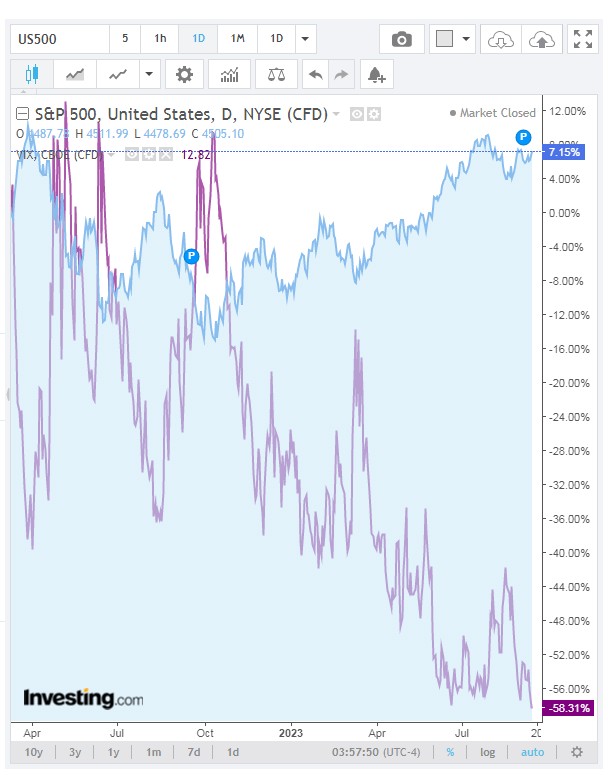 파란색 그래프는 S&P500지수이고, 보라색 선은 S&P500 VIX 지수입니다. 약 15개월간의 변동을 그래프로 그려서 비교해봤습니다.