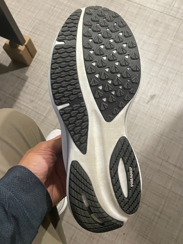 - 매쉬 갑피가 편하고, 발가락 쪽 공간이 여유가 많습니다. 보통 “토박스(toe box)”라는 용어를 쓰는데, 발가락이 들어가는 공간에 여유가 있어서 발가락 꼼지락거리는 데 아무런 불편이 없습니다. 원래 푸마 런닝화들이 전반적으로 토박스가 여유있는 편인데 최근 나왔던 포에버 런 니트로의 경우는 약간 토박스가 좁아져서 거슬렸습니다만, 이번에 나온 매그니파이 니트로2는 지금까지 제가 신어본 런닝화들 중 가장 여유로운 토박스라고 봅니다. 여유로운 토박스라고 하면 대게 아식스 젤 카야노를 떠올리고는 했는데, 젤 카야노보다도 훨씬 여유롭고 편합니다. 통기성도 최고 수준입니다.