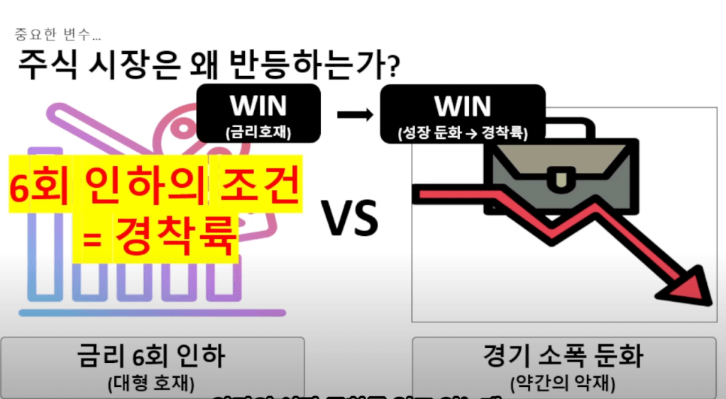하지만, 현재 채권시장의 시장금리하락은 무려 150bp, 이는 내년에 6회 이상의 기준금리인하를 상정하는 것과 같은 강도입니다. 이정도 금리인하는 연착륙이 아닌 “경착륙”이 아니면 나올 수 없는 수준의 기준금리인하죠. 채권시장이 바라보는 시나리오는 주식시장이 바라보는 미래와 완전히 딴판이라는 걸 이해해야 합니다.