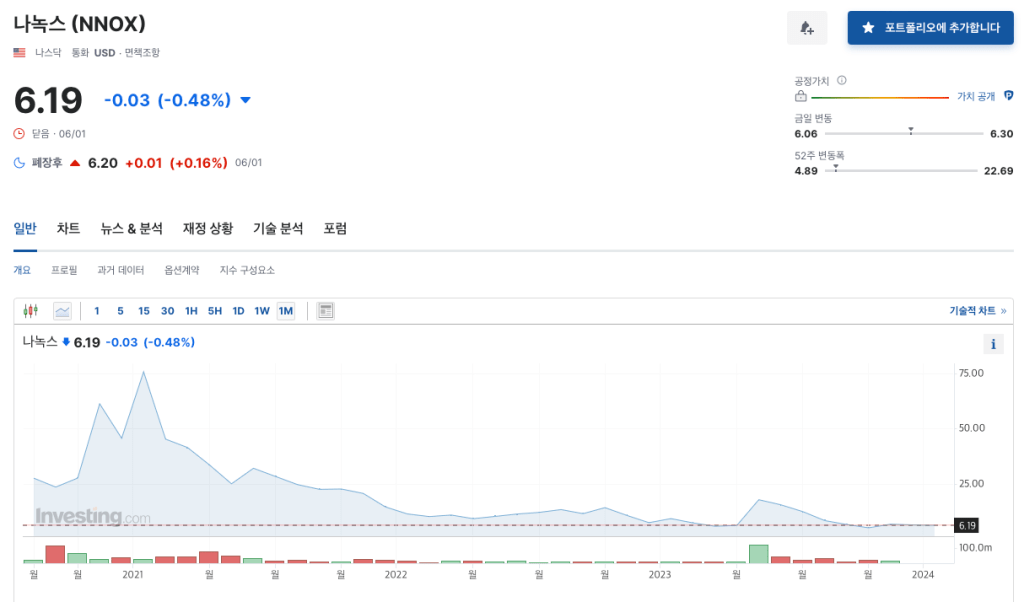 그랬던 나녹스의 현재 주가는 6.19달러, 최고가였던 75달러의 10분의 1도 안되는 상황이죠. 그렇다면, 주가가 충분히 저평가되어있으며, 앞으로 크게 상승할 가능성이 있다는 의미일까요?