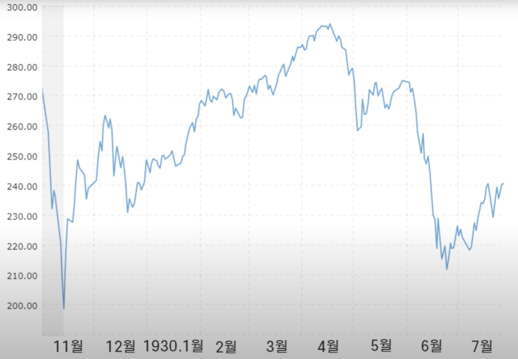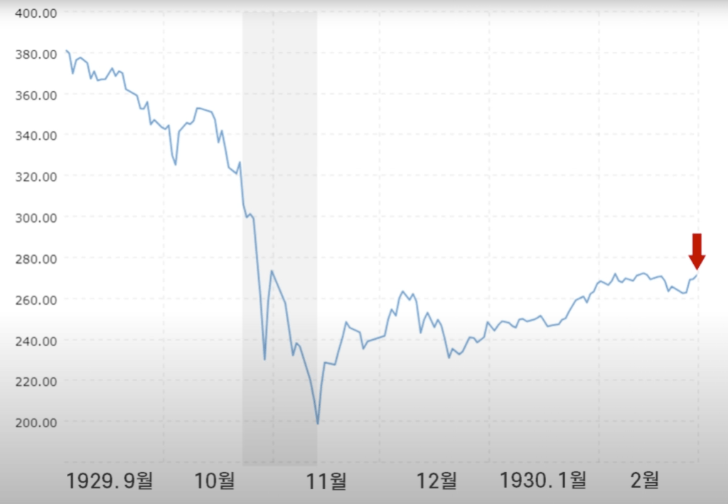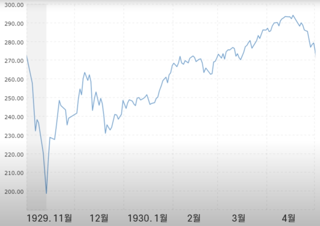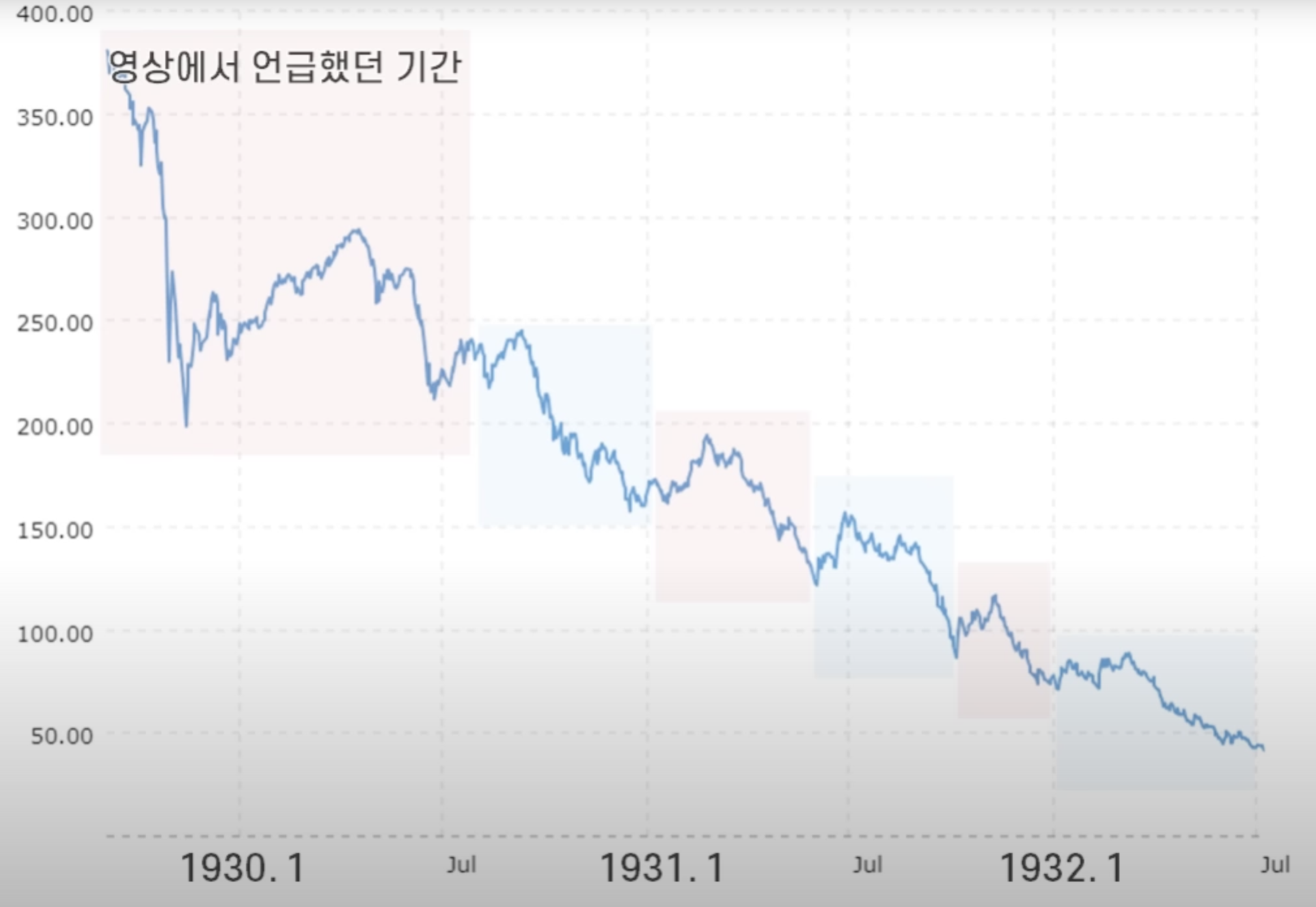 맨 처음 일어났던 폭락 시점에서 지금까지 있었던 주가변동이 “영상에서 언급했던 기간”이라고 표시되있는 구간 동안 나왔던 주가지수의 변화였습니다. 기간으로 따지면 약 9개월 간의 변동이었죠. 진짜 문제는 그 다음부터입니다. 엄청난 하락 이후 약간의 반등 내지 회복의 패턴(이른바 대드 캣 바운스)이 이후로도 다섯번을 내리 반복하면서 3년만에 다우지수는 고점 대비 무려 10분의 1토막(89% 하락)이 나버립니다.