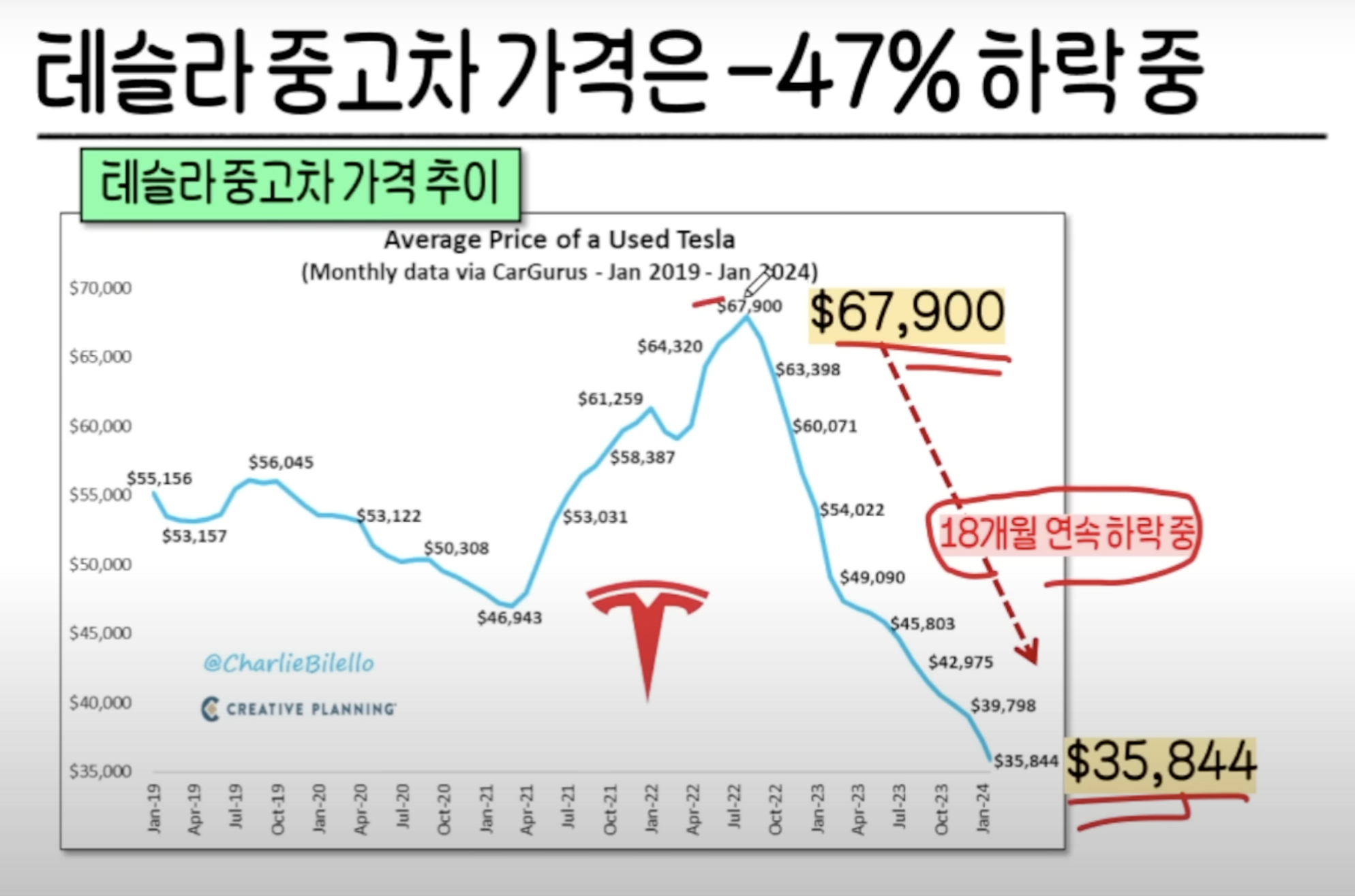 당시의 테슬라 중고차 가격을 가지고 테슬라의 상황을 짐작하는 건 불가능합니다. 다른 회사의 중고차들도 다들 새차보다 비싸거나 큰 차이가 없던 때였으니까요. 문제는 현재 중고차 가격이 인플레이션과 공급망 이슈로 중고차 가격이 올라가기 시작하던 때보다도 훨씬 크게 떨어졌다는 점입니다. 이건 테슬라에게 분명 안좋은 신호가 될 수 있습니다.