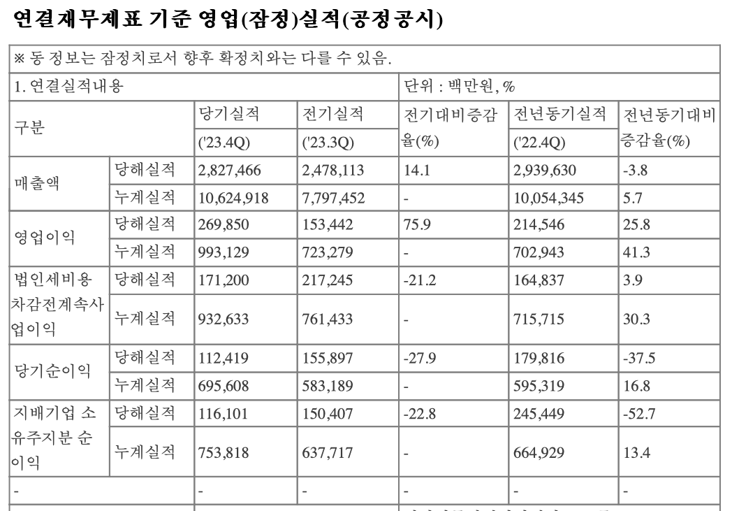 영업이익이 2,700억원으로 예상보다 높게 나왔으며, 이는 이전 3분기 대비 76%, 22년4분기 대비 26% 증가한 수치입니다.