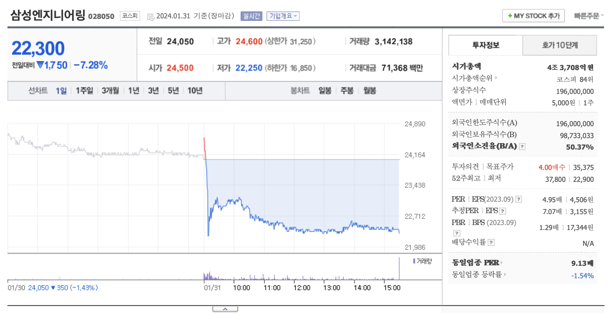 그런데, 이렇게 좋은 실적공시가 나오고 다음날인 오늘 아침, 삼성엔지니어링 주가는 크게 떨어졌습니다. 장이 열리자마자 수직 하락해 7% 하락한 상태로 끝났죠. 왜 이렇게 되었을까요?