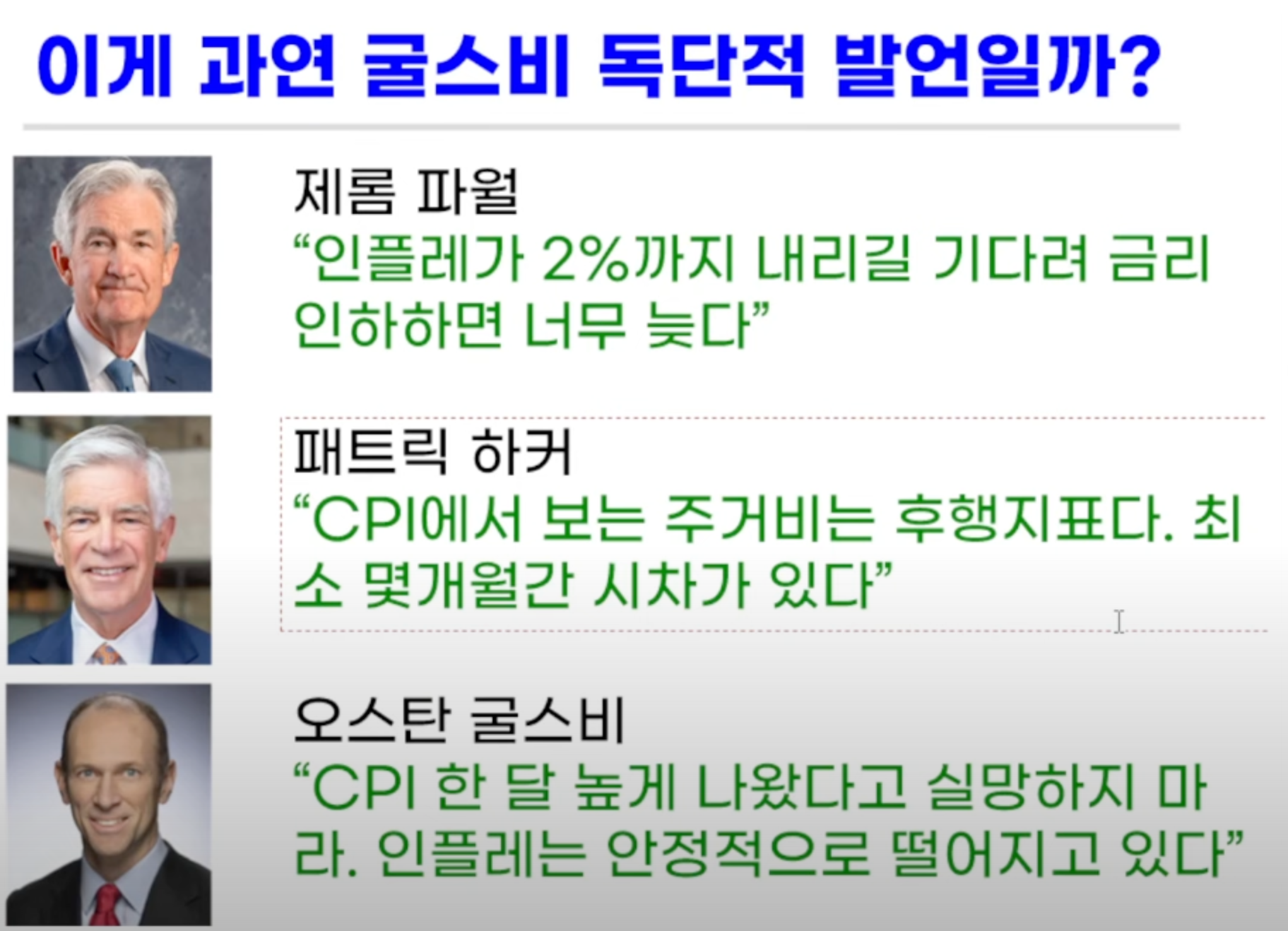 이틀 전 미국 주식시장에 닥쳤던 강한 변동성이 정확히 무엇때문에 진정되었는지 굳이 말하자면 오스탄 굴스비 시카고 연은 총재의 발언 때문이라 알려져있습니다. 위에 홍장원의 불앤베어 영상에서도 언급했듯이 오스탄 굴스비 총재의 발언은 그 이전부터 거듭되오던 연준 인사들의 CPI관련 언급들 중에서도 단연 명확하고 적극적입니다. 그래서 첫 날 제대로 된 상황인식도 없이 일단 도망치고 보자는 패닉국면에 빠졌던 시장이 제정신을 차리고 질서정연하게 buy the dip을 할 수 있었던 거겠죠.