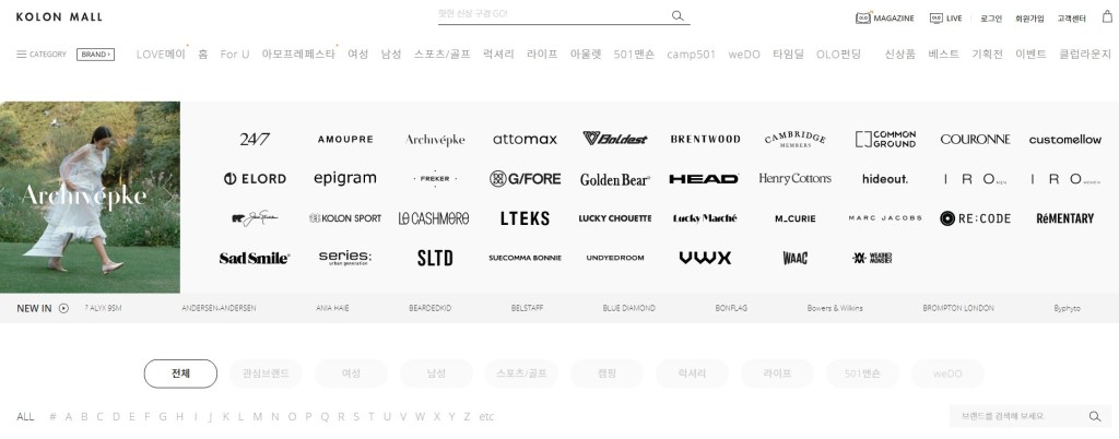 온라인 의류 유통으로 크게 성공한 무신사를 벤치마킹했는지, 코오롱몰에서도 여러가지 의류브랜드들을 함께 취급하고 있습니다. 아웃도어 의류가 아닌 패션브랜드나 럭셔리 브랜드들도 취급하고, 심지어는 아크테릭스나 나이키 의류까지 취급하고 있더군요. 평소 패션의류에는 관심이 없더 저같은 경우는 전혀 들어보지도 못한 브랜드들이 많았습니다.