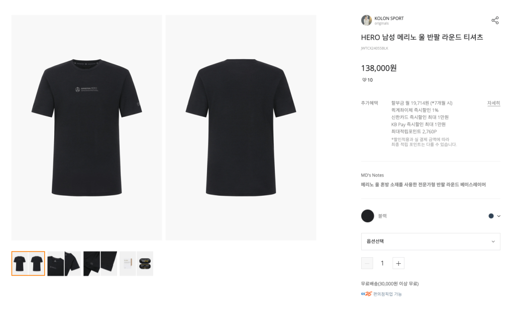 - 코오롱 HERO 남성 메리노 울 반팔 티셔츠 ( https://www.kolonmall.com/Product/JWTCX24055BLK )