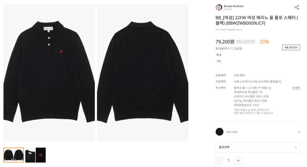 2. 브룩스브라더스(BB) 22FW 여성 메리노 울 폴로 스웨터 ( https://www.kolonmall.com/Product/K1671606770082031NO01 )