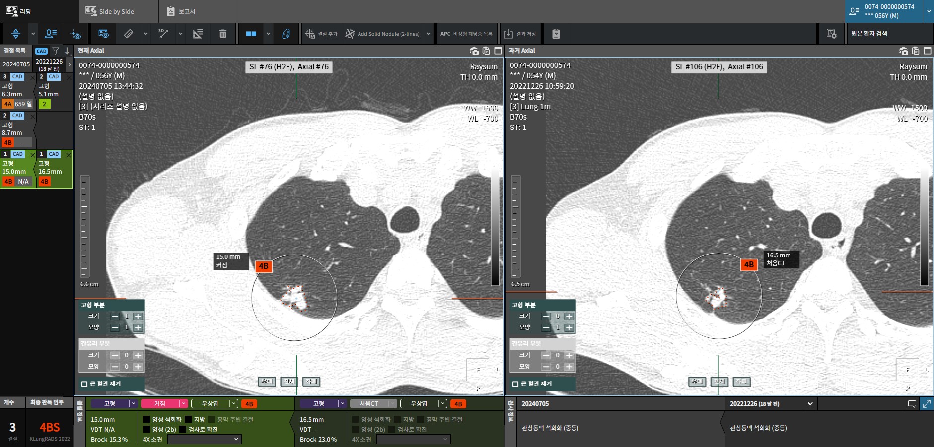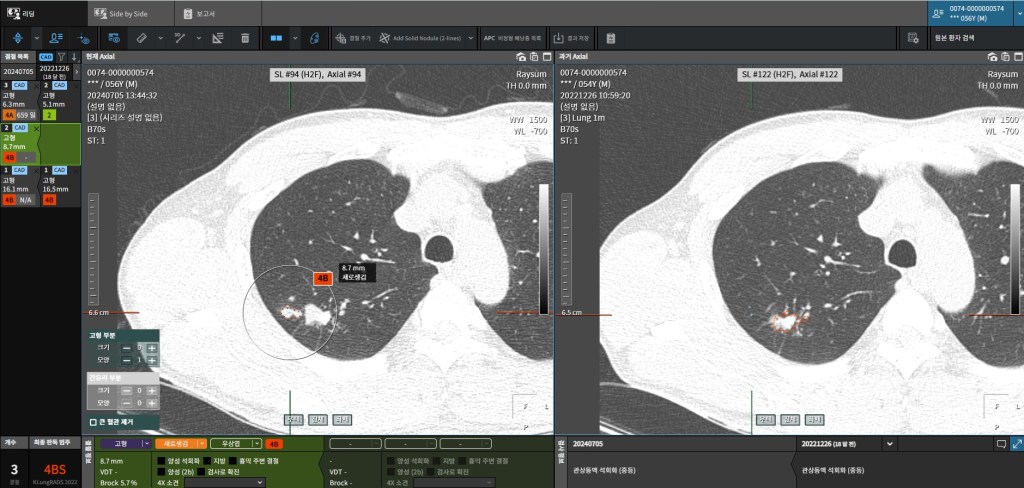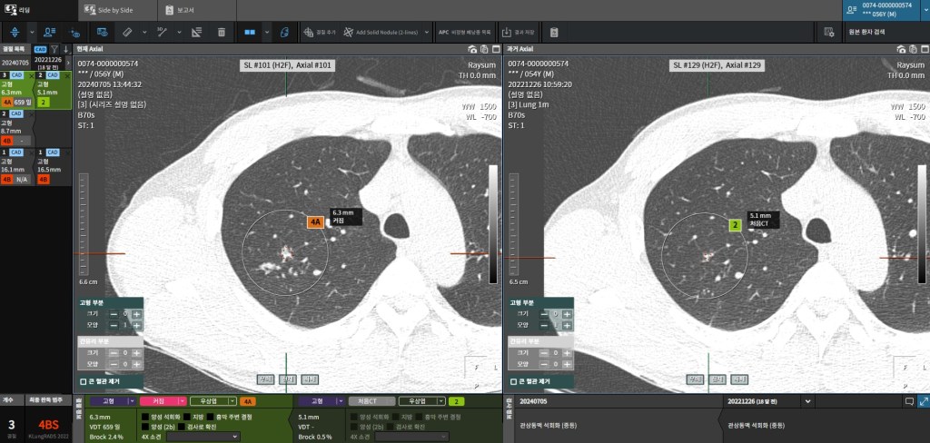 좀 더 아래쪽에 위치한 폐결절의 영상입니다. 왼쪽 2024년의 폐결절이 2022년 영상에 비해 폐 크기가 커졌고 음영도 더 뚜렷하게 보입니다.