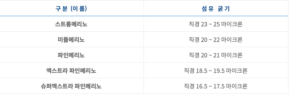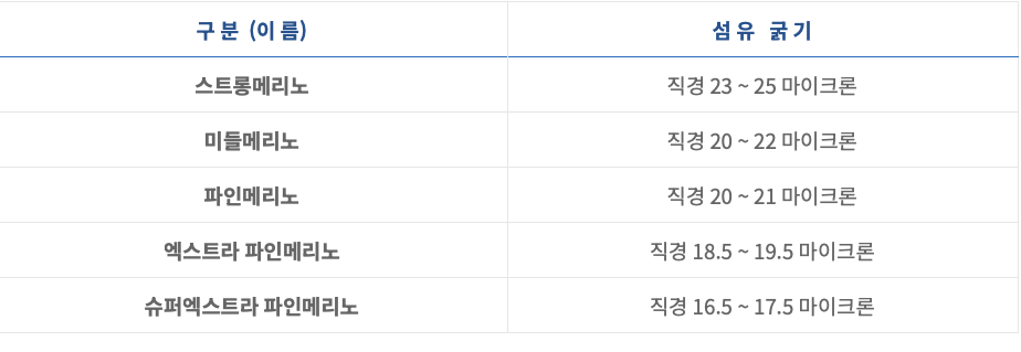 보통의 의류에 사용하는 일반적인 양모의 굵기는 30-40마이크론, 메리노울의 굵기는 17-20마이크론 정도입니다. 그리고, 메리노 울 중에서도 굵기에 따라 여러가지 이름이 존재합니다.