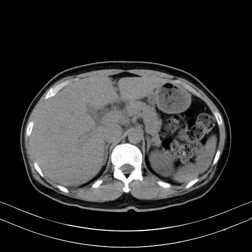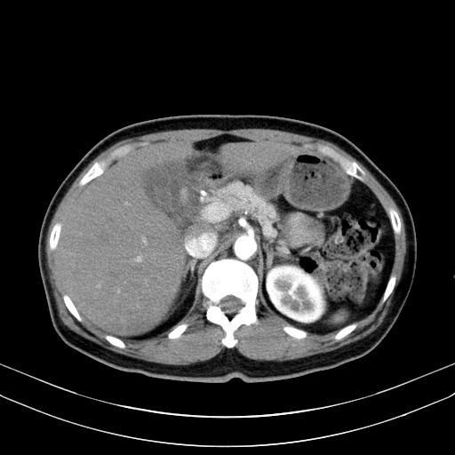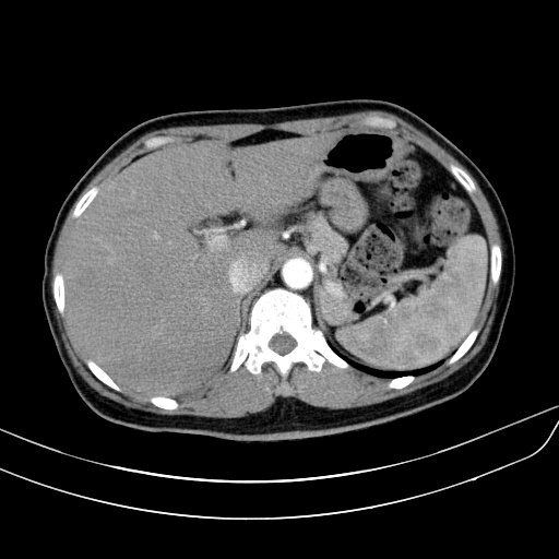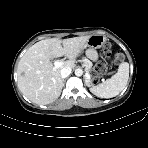 상복부통증을 주소로 내원한 50세 남자환자의 복부CT영상입니다. 담낭벽이 두꺼워져 있어 담낭염이 의심되어 치료하였으며, 조영증강 전 및 조영증강 후 영상에서 간 내에 별다른 국소병변은 보이지 않습니다.