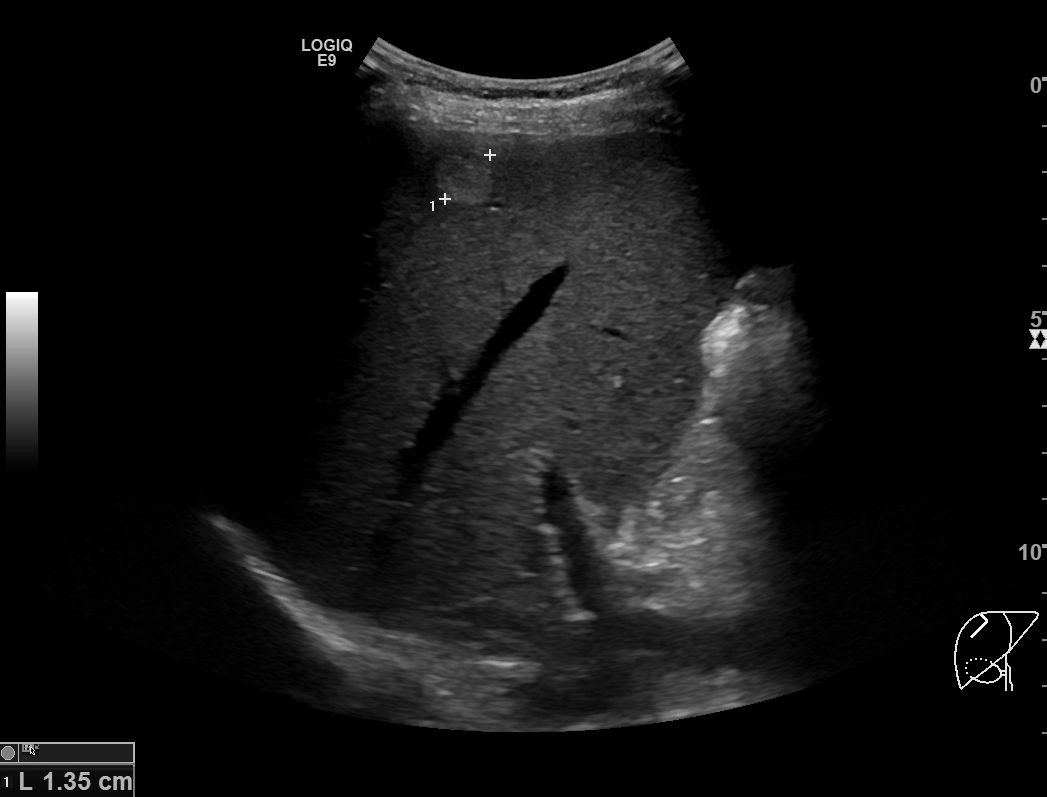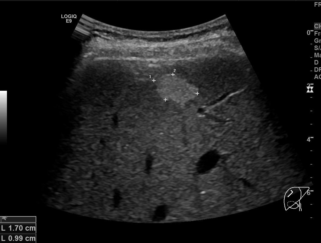 2개월 후 담낭염의 호전여부를 확인하기 위해 간초음파를 시행했습니다. 담낭벽비후는 깨끗하게 호전되었는데, 간우엽에 고에코음영의 종괴가 발견되었습니다. 이전 복부CT영상을 다시 확인해도 전혀 보이지 않는 종괴였으며, 크기가 1.7센티미터로 크기가 작아서 확인이 안될 상황은 전혀 아니었습니다.