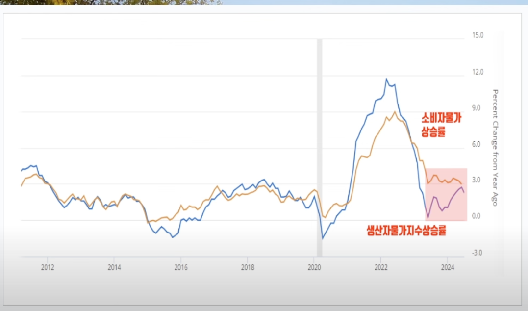 - 2023년6월경 생산자물가지수는 바닥을 찍은 후 현재까지 가파르게 상승하고 있다(붉은 상자로 표시된 구간). 이번에 발표된 생산자물가지수의 상승율 하락이 이런 추세가 꺽였다고 판단하기에는 너무 미미한 하락이었다. 아직도 전반적인 추세는 상승구간이다.