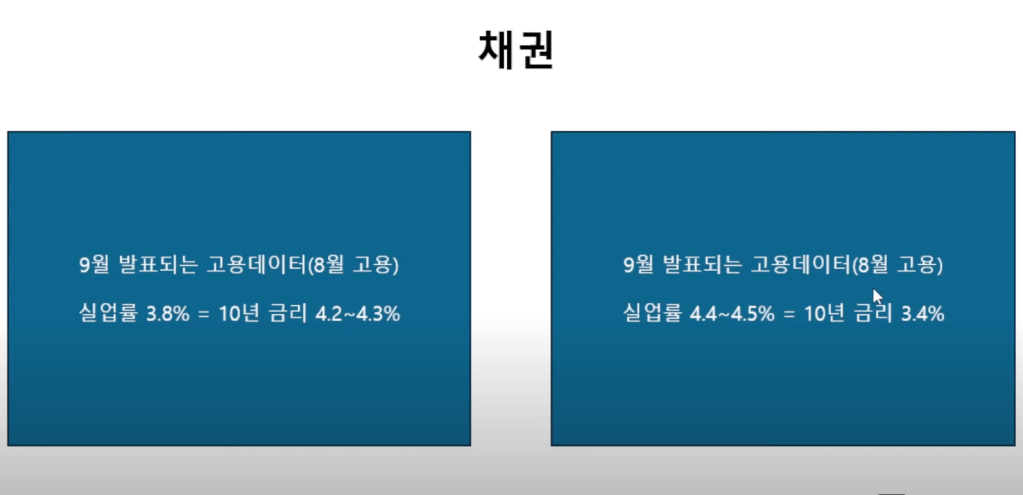가장 극단적인 갈림길이 9월에 발표되는 8월 고용데이터라고 생각합니다. 주식의 코드가 예측하는 것처럼 실업율데이터가 낮게 나온다면 지금까지 선반영되었던 기대감이 모두 되돌려지면서 미국채 10년물 금리가 폭등해 4.2-4.3%대로 올라갈 것이고, 실업율이 4.4% 이상이 나온다면 10년물 금리가 3.4%까지도 추가로 떨어질 수 있다는 극단적인 갈림이 이 때 나오는 것이지요.