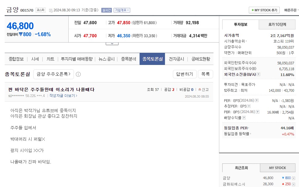 요즘 갖가지 악재가 겹치며 하락세가 완연한 금양 관련해서 수많은 사람들이 네이버 종토방에서 글을 쓰고 댓글을 덧붙힙니다. 추락하는 것에 날개는 없지만 수많은 이들의 관심을 뜨겁게 불러일으키며 종토방 글들을 양산하고 있는데, 주식하는 사람들 중에는 고수가 아니어도 깊이를 측정할 수 없는 지혜를 보유한 사람들이 많습니다.