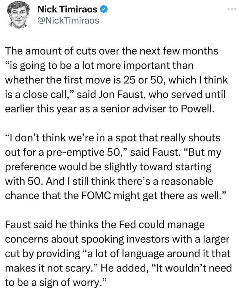하지만, 위에 나온 월스트릿저널 닉 티미라오스의 글처럼 이번 FOMC의 금리결정보다는 다음 몇 달 동안의 인하폭이 어느정도가 될 것인지가 훨씨 더 중요하다는 의견에 저도 동의합니다. 지금 이 순간 연준의 관심사는 시장을 놀라지 않게 다독이는 데 있습니다. 20bp 인하를 선호하겠지만 설령 50bp 인하를 하더라도 보험성 인하임을 강조하는 언급을 잊지 않고 포함시키면서 시장을 다독여줄 가능성이 높다고 생각합니다.