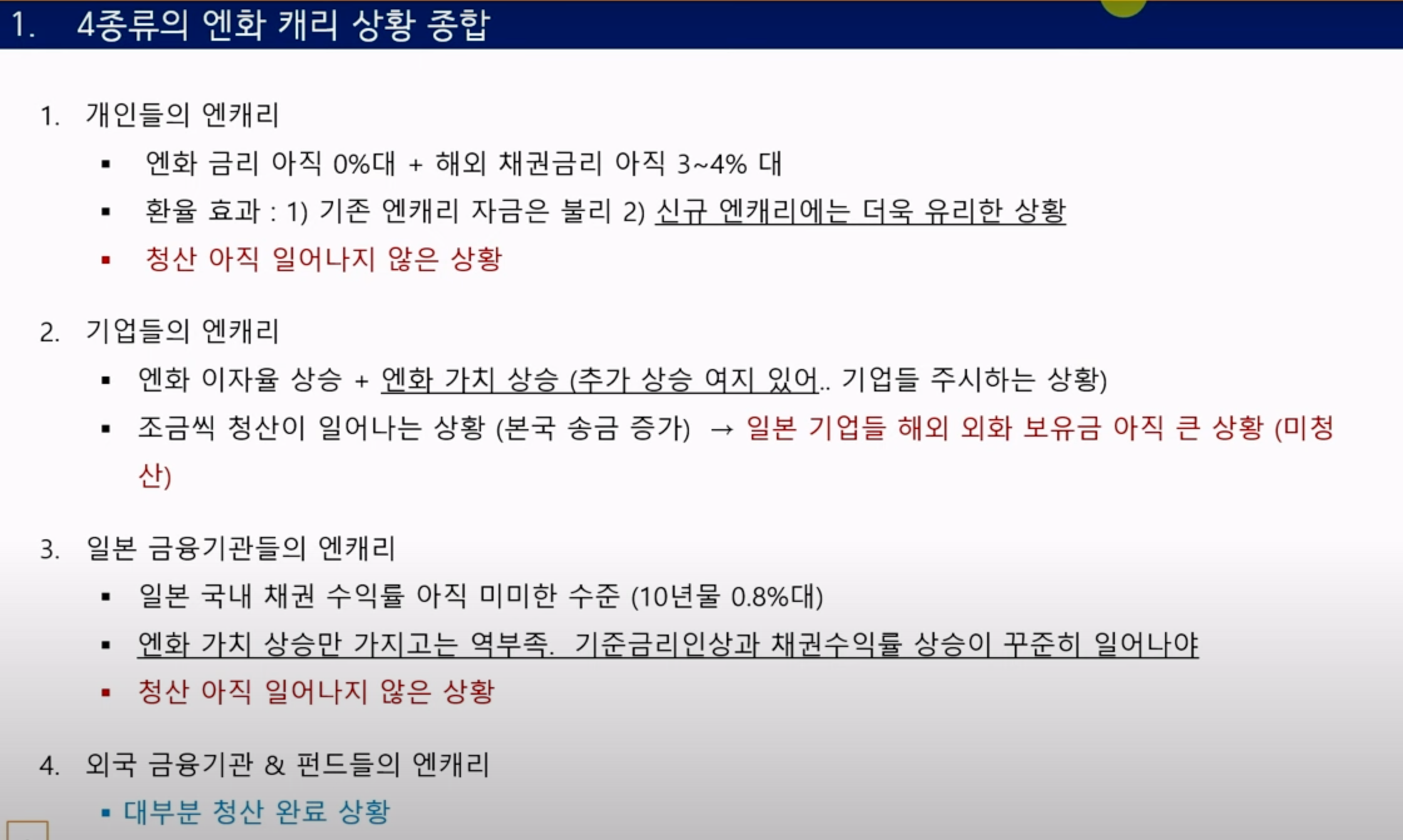 2분47초 영상에서 엔캐리 자금흐름의 주체가 누구냐에 따라 네 가지 종류를 구분하고 있는 부분을 캡쳐해봤는데, 여기에 나온 것처럼 현재는 국제 금융기관들과 헷지펀드들의 엔캐리 트레이딩 자금만 청산되었을 뿐 일본 내 개인 자산가들, 일본 수출기업들 및 일본 내 금융기관들(특히 보험사)들의 장기적인 엔캐리 트레이딩 자금은 거의 청산되지 않았습니다.