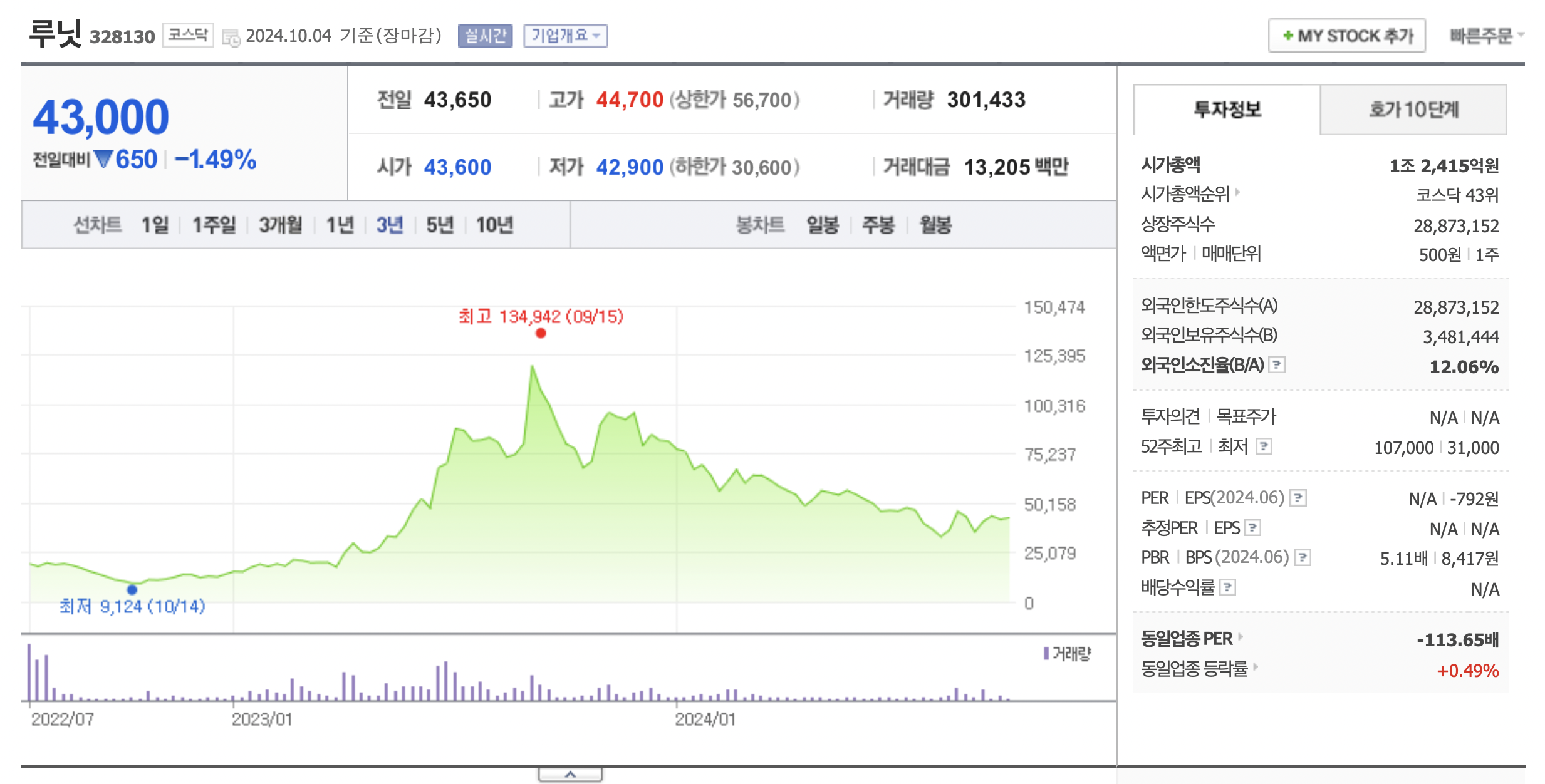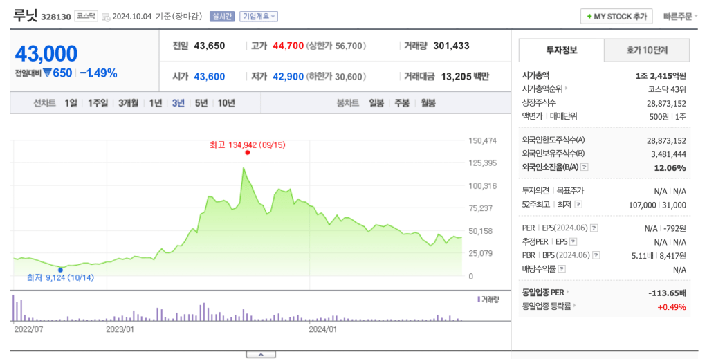 위 그림은 인공지능 의료 솔루션 업체인 루닛의 3년간 주가 차트입니다. 고점인 13만원대를 작년에 찍고 지금 주가는 고점 대비 3분의1 수준이 되었습니다.
