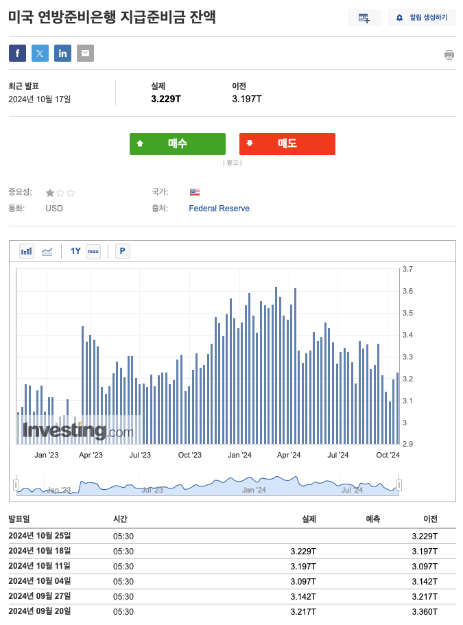 그렇게 QT를 지속하면서 점점 연준의 지급준비금은 올해 하반기부터 점점 줄어들고 있습니다. 정확히 어느정도 수준을 목표로 해왔는지는 모르나, 연준이 쓸데없는 과잉유동성으로 간주하고 있는 지급준비금 잔액이 특정수준까지 충분히 감소하게 된다면, 그 때부터는 QT를 중단하거나, 중단 일정을 공개할 것입니다. 그것이 연준의 일정이니까요. 대체적인 그래프의 기울기를 본다면 올해 연말 또는 내년초가 되지 않을까 짐작하지만, 결국은 연준이 어떤 기준과 일정을 가지고 있느냐에 달려있겠지요.