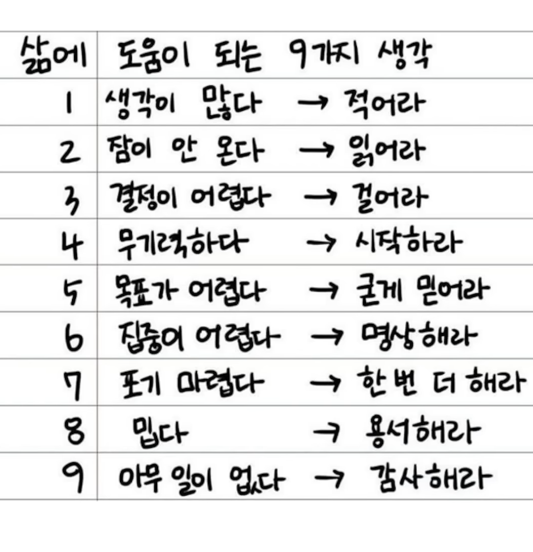 특히 4번이 살면서 큰 도움이 되더군요. 무기력하면 일단 시작하라는 조언,,, 이미 무얼 해야 하는지는 결정된 상황인데도 그걸 시작하지 못하고 무기력증에 빠져있는 경우는 일단 시작하는게 정말 큰 도움이 됩니다. 내가 힘들고, 심리적으로 어렵거나 육체적으로 피곤하다는 게, 그 일을 시작하면 안되는 이유는 될 수 없다는 걸 몸으로 깨닫게 되는 순간 그 일을 할 수 있게 되는게 문제가 아니라 무기력감이 거짓말처럼 사라지게 됩니다.