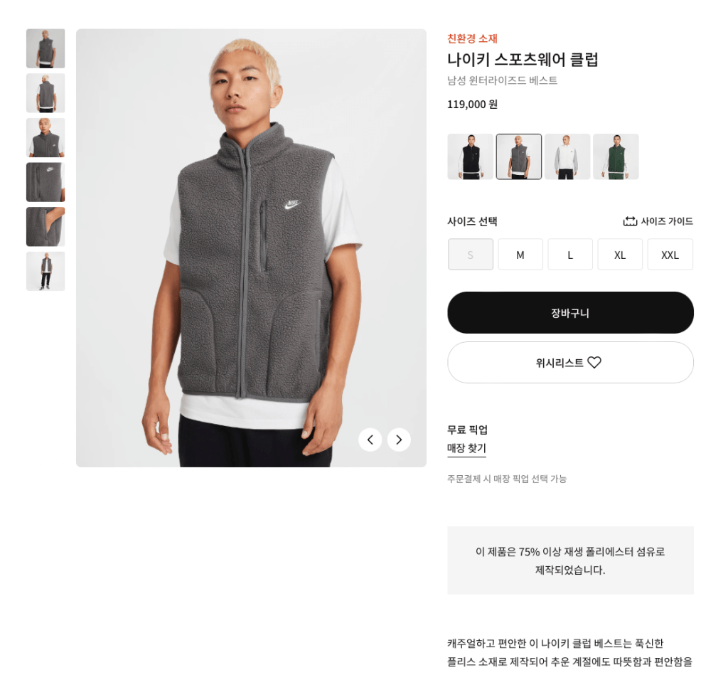 원단의 바깥면이 솜털처럼 처리되어있는 플리스 원단으로 만든 조끼입니다. 모델명은 FZ0895. 이런 플리스 조끼는 원가가 싸고 만드는 것도 어려운게 아니라서 다른 브랜드들에서도 더 싸거나 더 따뜻한 성능으로 많이 나와있습니다. 나이키만의 특장점이나 연구개발이 들어있넌 건 없기 때문에 마음에 드는 디자인이나 다른 브랜드 제품을 선택해도 별 지장이 없습니다.