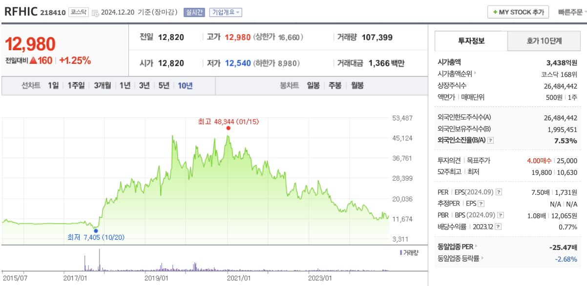 참고로 저는 4-5개정도 종목을 포트폴리오로 들고가려고 생각하고 있는데, 일단 염두에 둔 종목 하나는 RFIHC입니다.