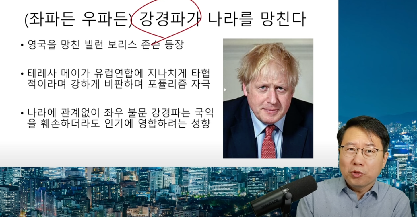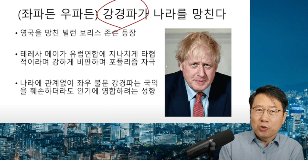 위 유투브 영상에서 보리스 존슨 전 총리가 바로 그런 꼴통 강경파의 전형적인 사례였습니다. 열심히 자국 내에 기업들이 떠나지 않도록 열심히 노력했던 테레사 메이를 지나치게 타협적이라며 욕하면서 “포퓰리즘”을 자극했던 보리스 존슨,,, 결국 그가 취임하자 브렉시트 정책들을 밀어부치면서 유수의 대기업들이 영국을 떠났고 코로나 시국에 파티를 하는 등 대환장 파티를 하다 영국 경제는 완전히 골로 가버리게 되었습니다.