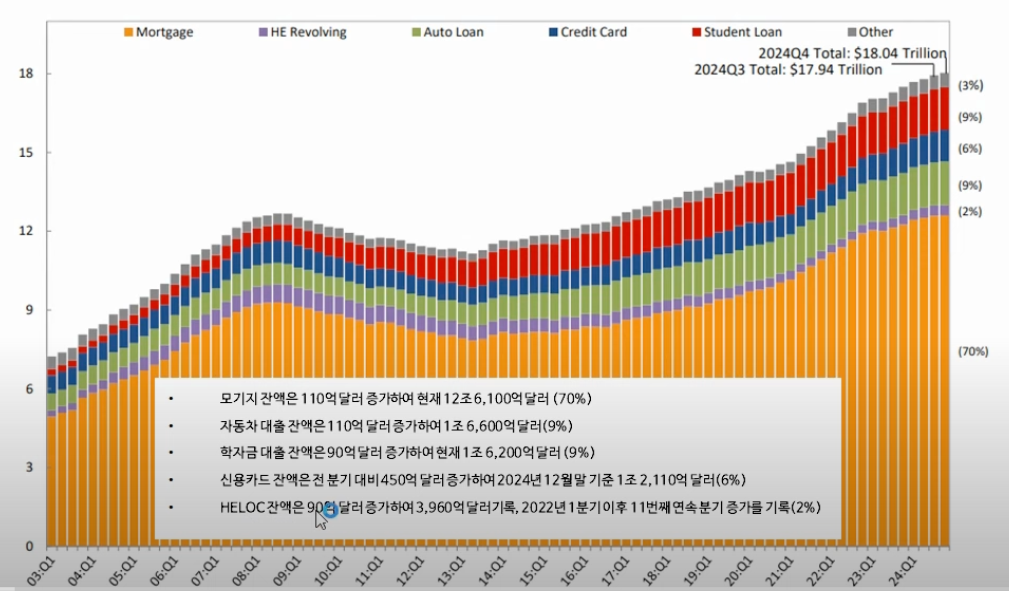 그렇다고 해서 과거 버블 때처럼 흥청망청하는 분위기냐면 부채의 증가율, 즉 증가속도만 따지면 과거 서브프라임 붕괴 직전의 상황때같이 가파른 가계부채증가가 지속되는 건 아닙니다. 위 영상의 초반부에 제시되는 그래프인데, 2008년 이전의 부채증가속도와 비슷한 가파른 상승세는 2020년 판데믹 이후부터 2022년까지 딱 2년간만 유지되고, 이후 부채의 증가세는 완연하게 꺽인 모습입니다.